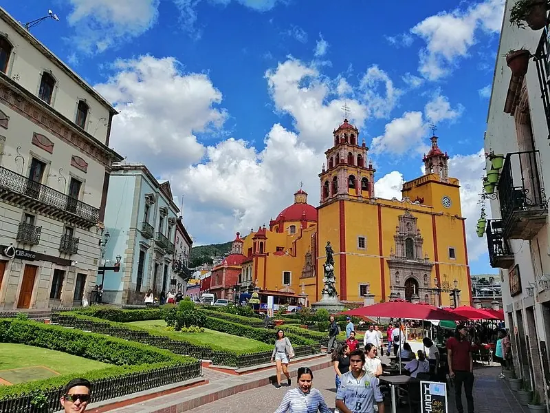Dominando la plaza principal de Guanajuato, se encuentra la llamativa Basílica de Nuestra Señora de Guanajuato, de color amarillo, coronada por una enorme cúpula rosa roja. Construido en 1696, el edificio presenta un estilo arquitectónico barroco mexicano, con detalles únicos dejados por mineros y magnates de la plata.